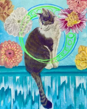 Black cat rendered on a bright orange and pink background, with flower and feather details
