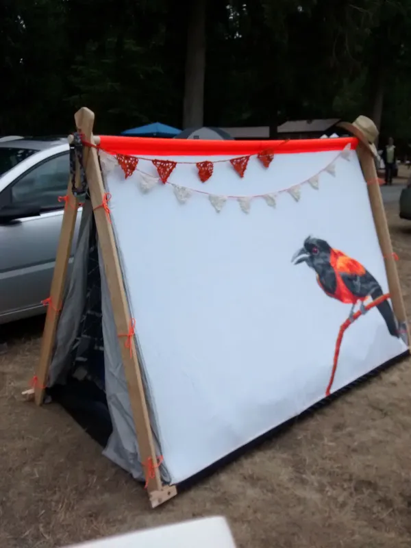 In 2015, I found some really neat printed festival tents that were very out of my starving student budget. So I decided to make my own 💅 The first year I used it it just had the Pithue painted on the side, and a few years later I got around to adding the swirls. It’s a fun little tent. The bird even glows in the dark, which is pretty hilarious when you’re laying inside at night and passers-by are discovering that fact and shining their flash lights on it!